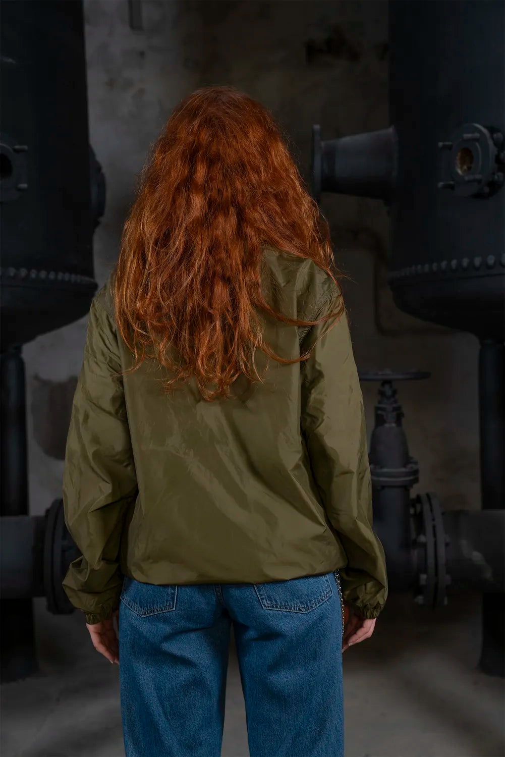 Fluorfreie wasserabweisende Beschichtung, Mesh-Futter — und trotzdem so leicht, dass du sie vergisst, bis der Wind kommt. Metall-Druckknöpfe, Kordelzug am Saum, Leistentaschen: alles, was du brauchst. Nichts, was du nicht brauchst.